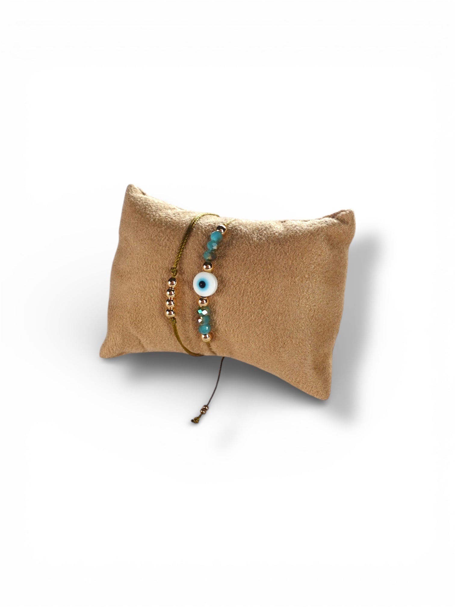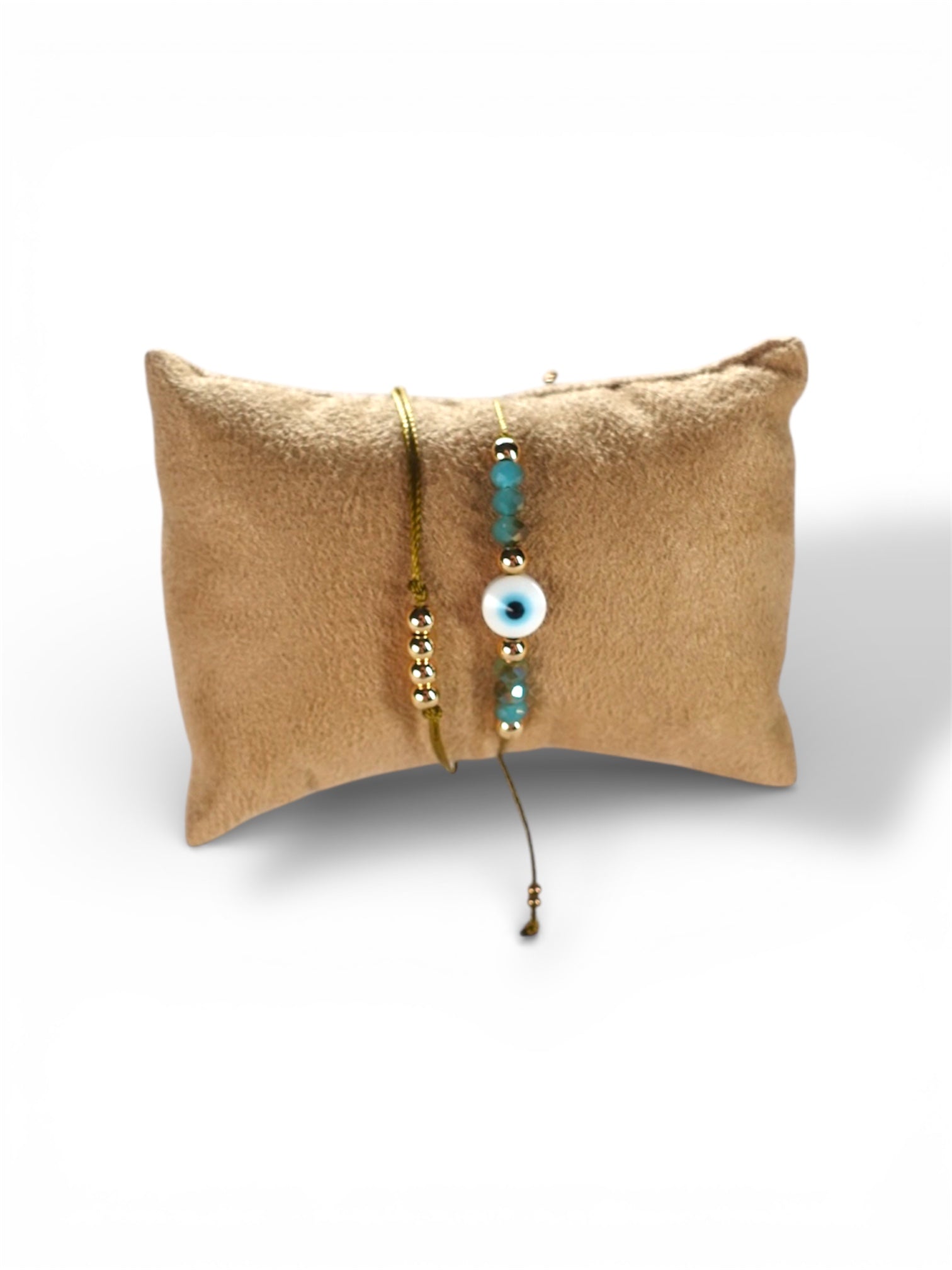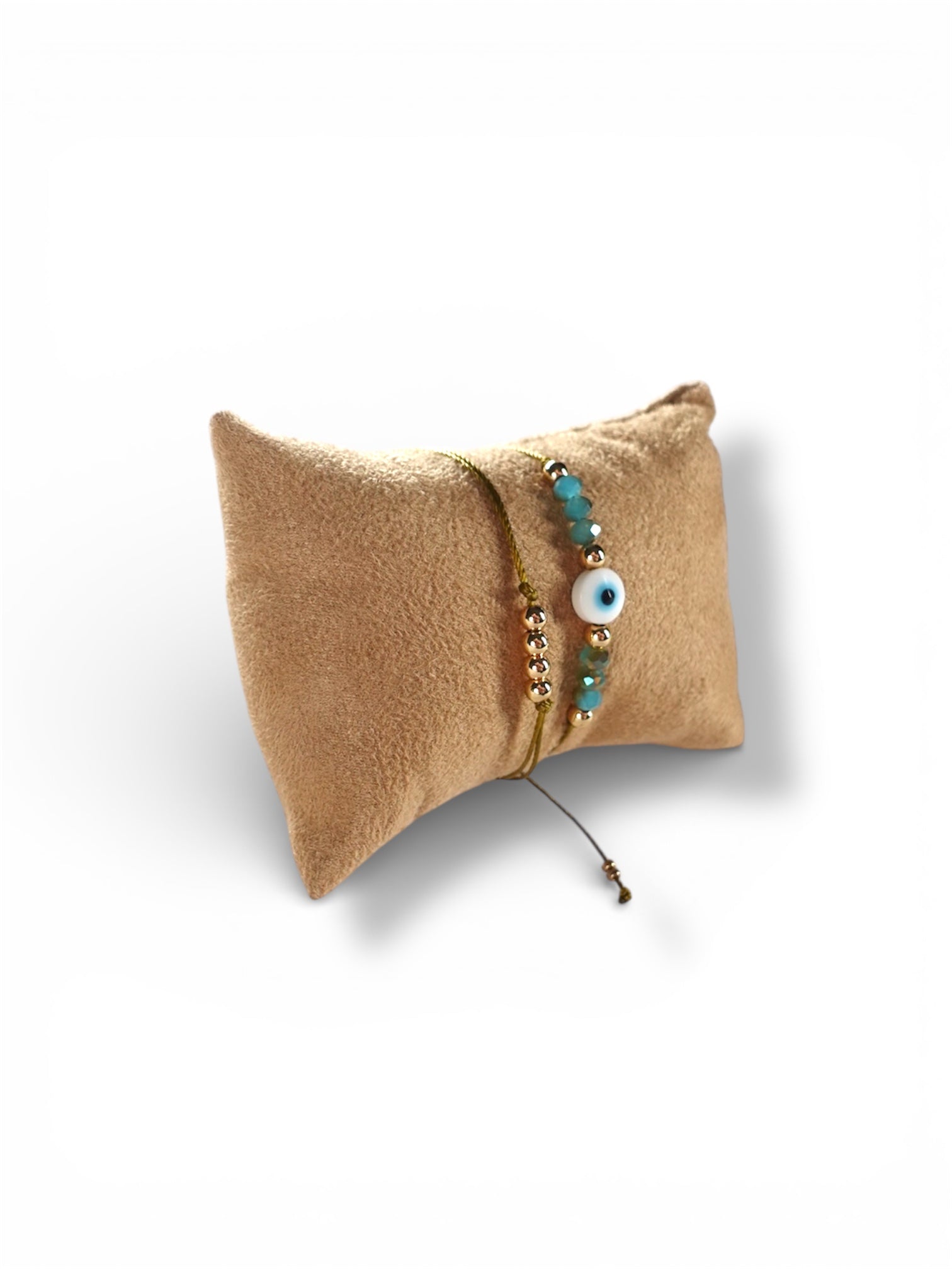 Inspirada en la calma del mar y la fuerza de la naturaleza, Nazar Esmeralda combina cristales turquesa con acentos dorados y el tradicional ojo protector central, creando una pieza equilibrada que transmite serenidad, protección y elegancia.